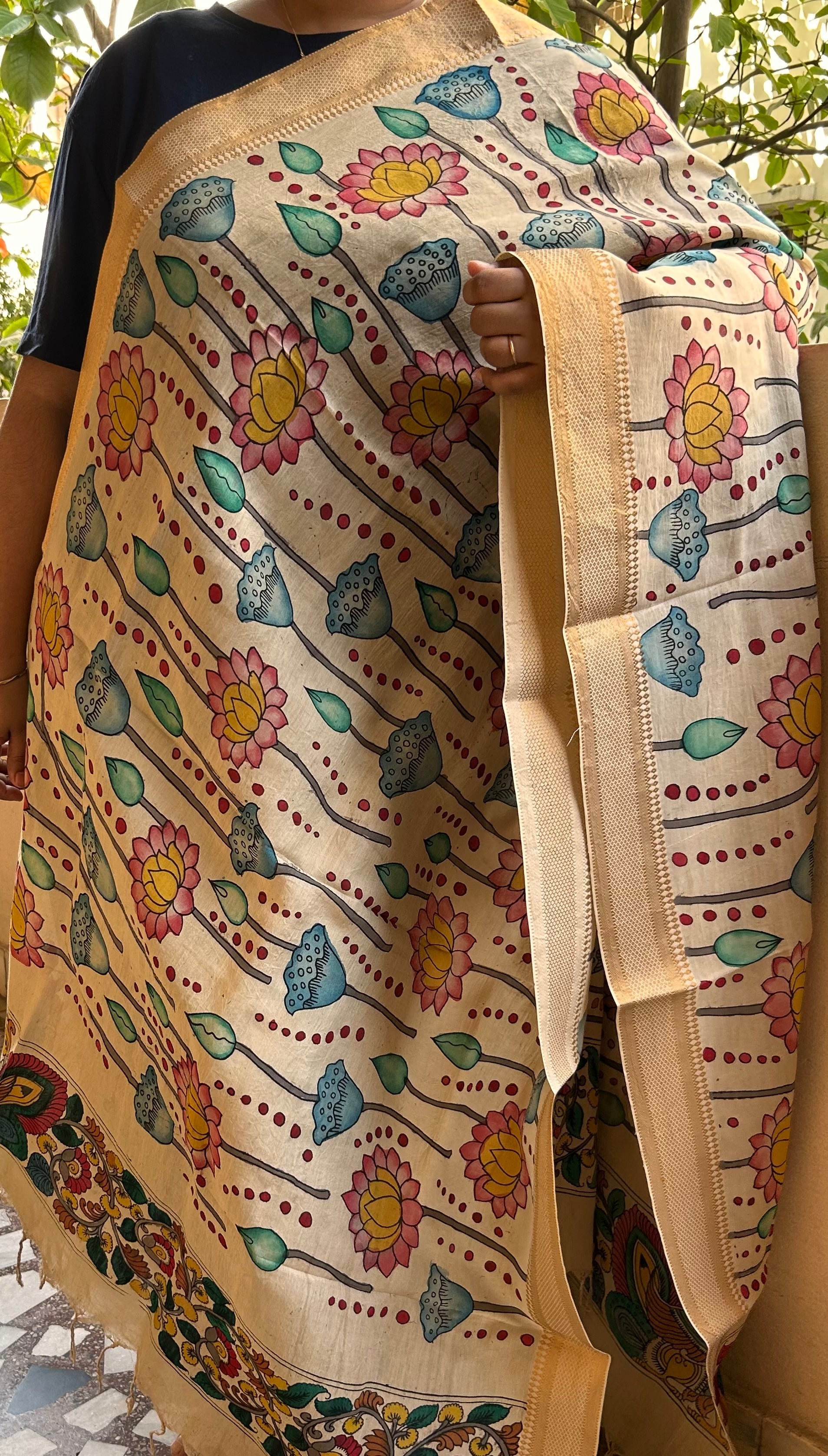 Beige Pen Kalamkari Dupatta in Bangalore Silk