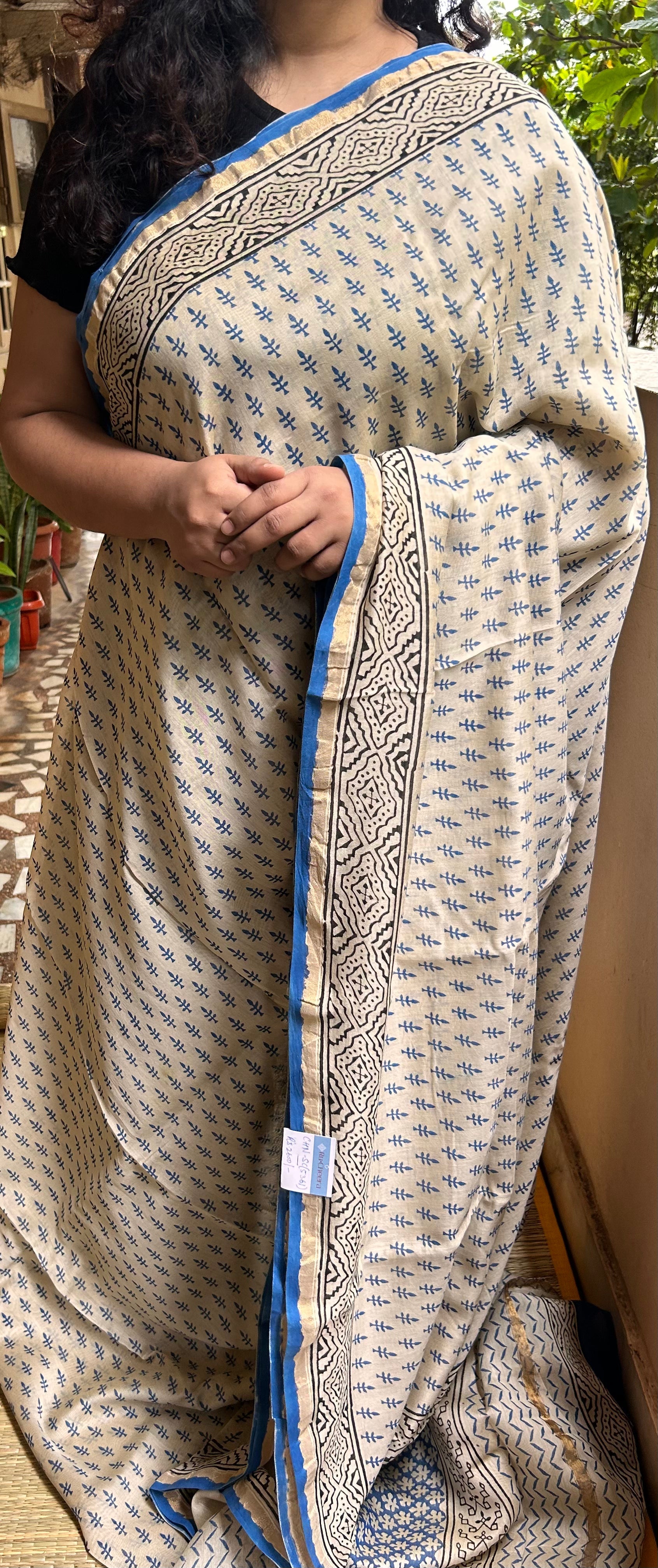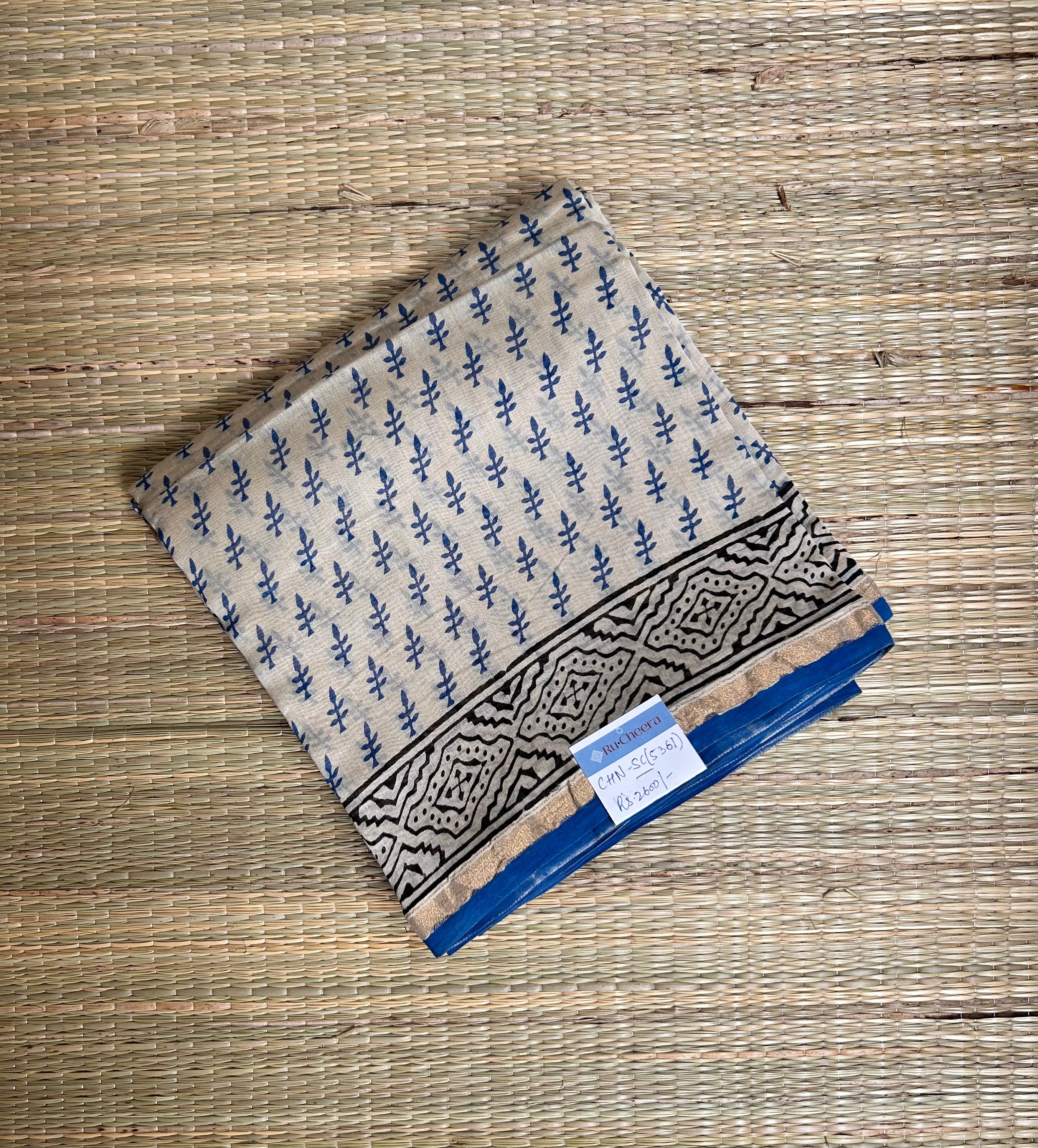 Beige & Blue Handblock-Printed Chanderi Saree