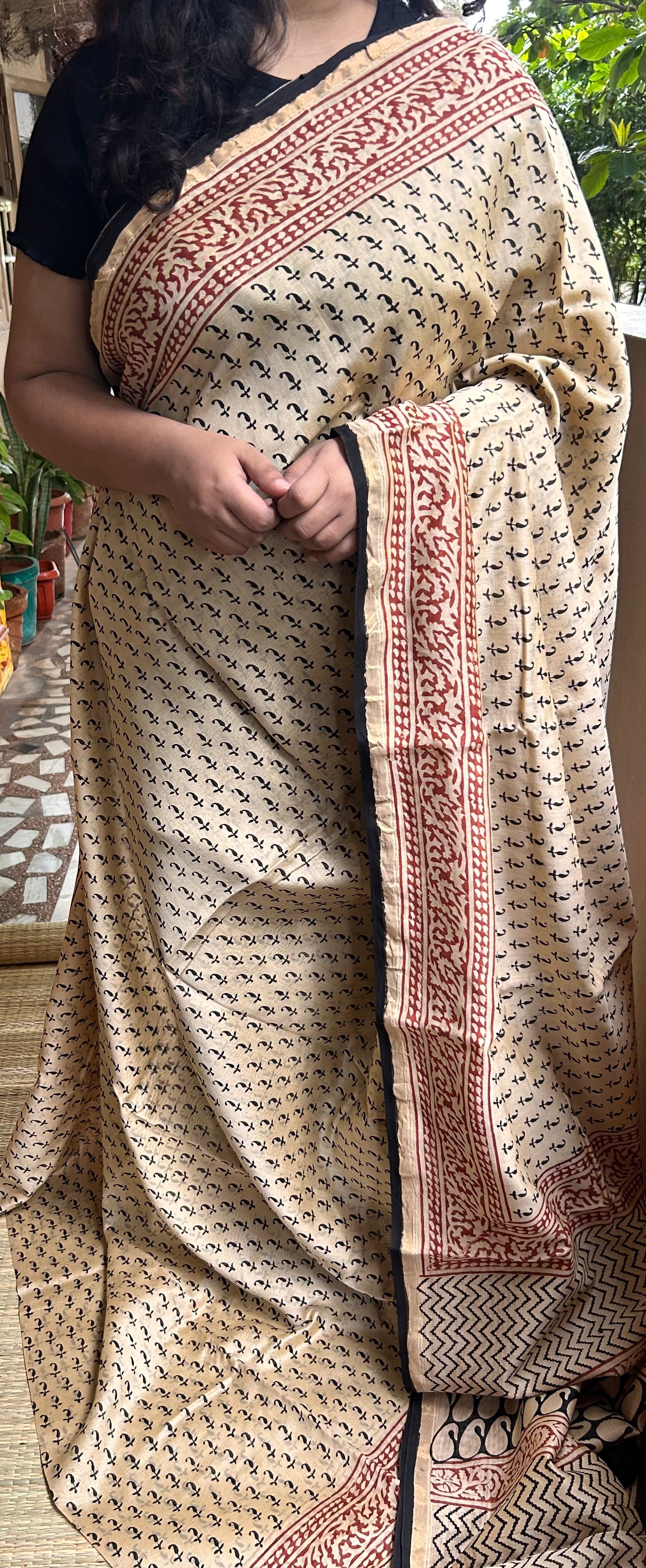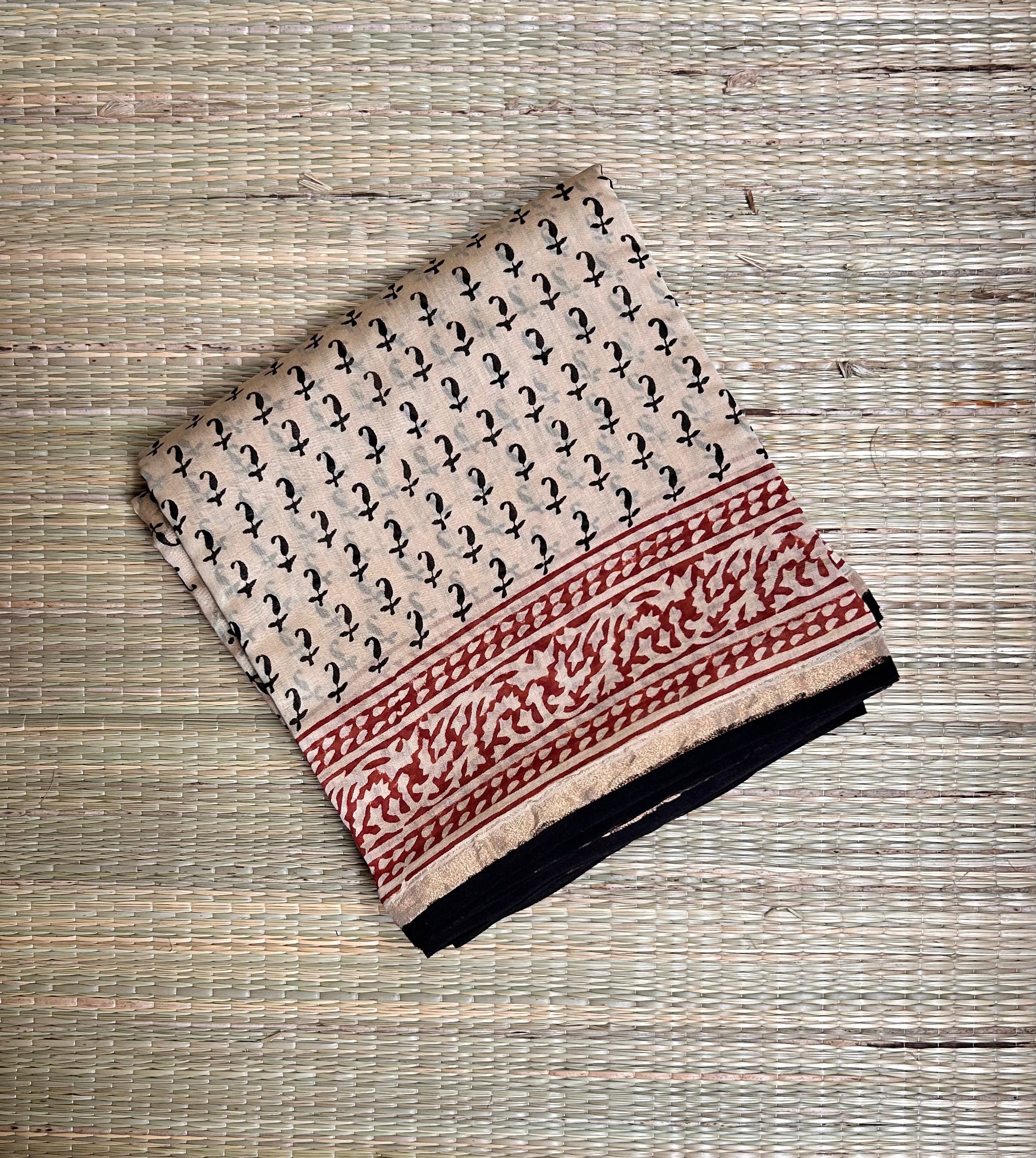 Beige & Black Block-Printed Chanderi Saree