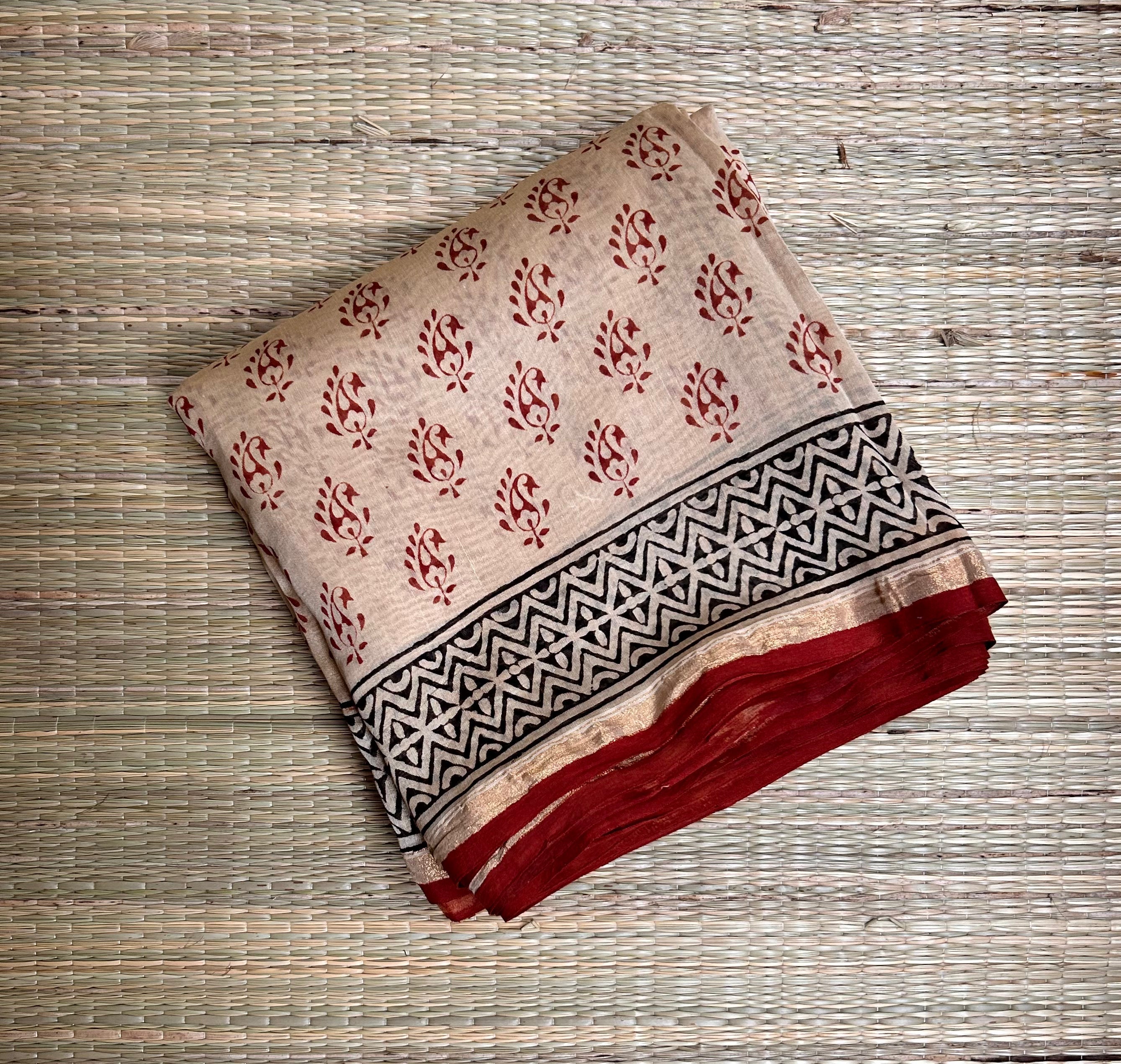 Beige & Rust Handblock-Printed Chanderi Saree