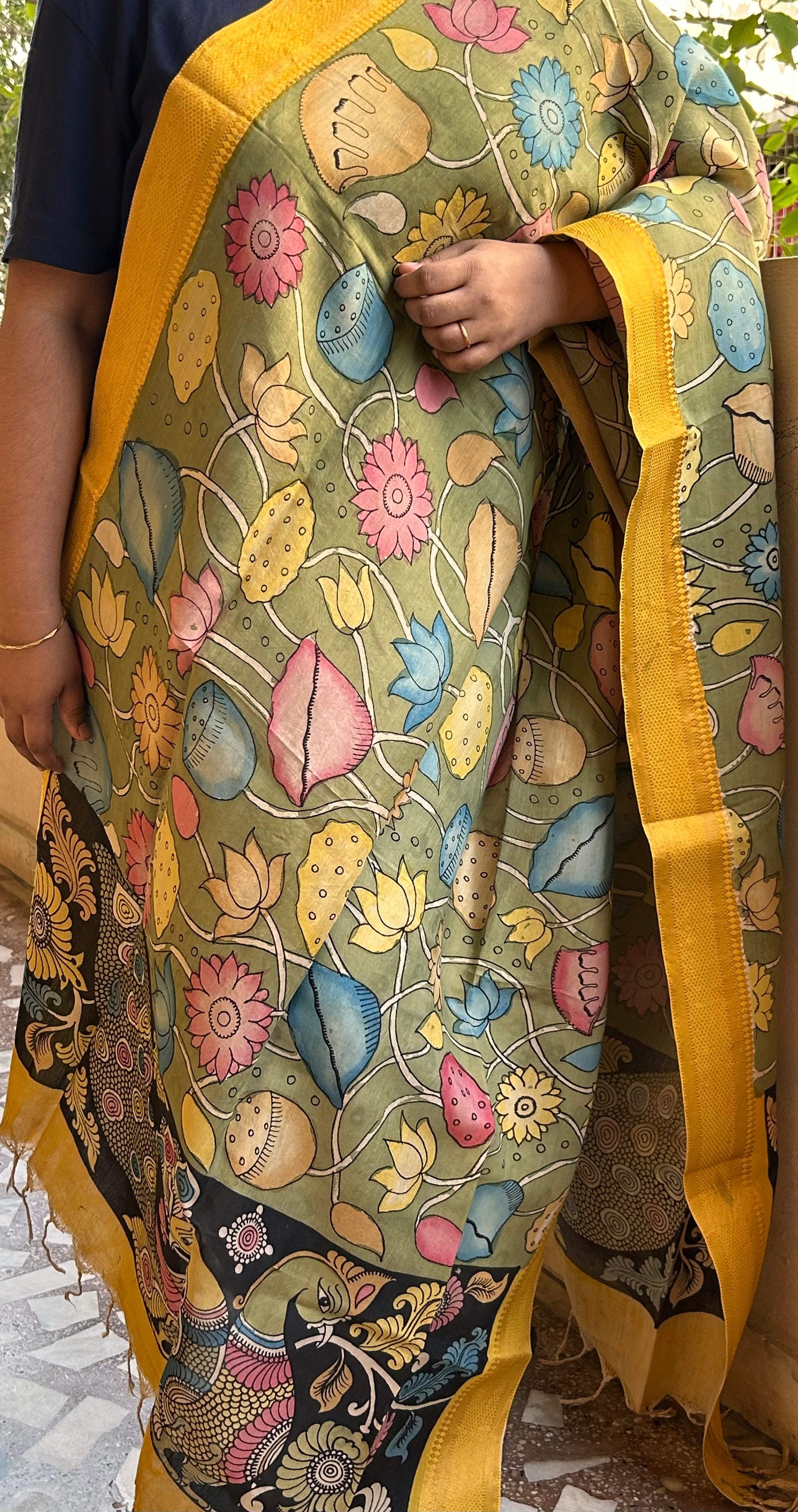 Yellow Pen Kalamkari Dupatta in Mangalagiri Silk