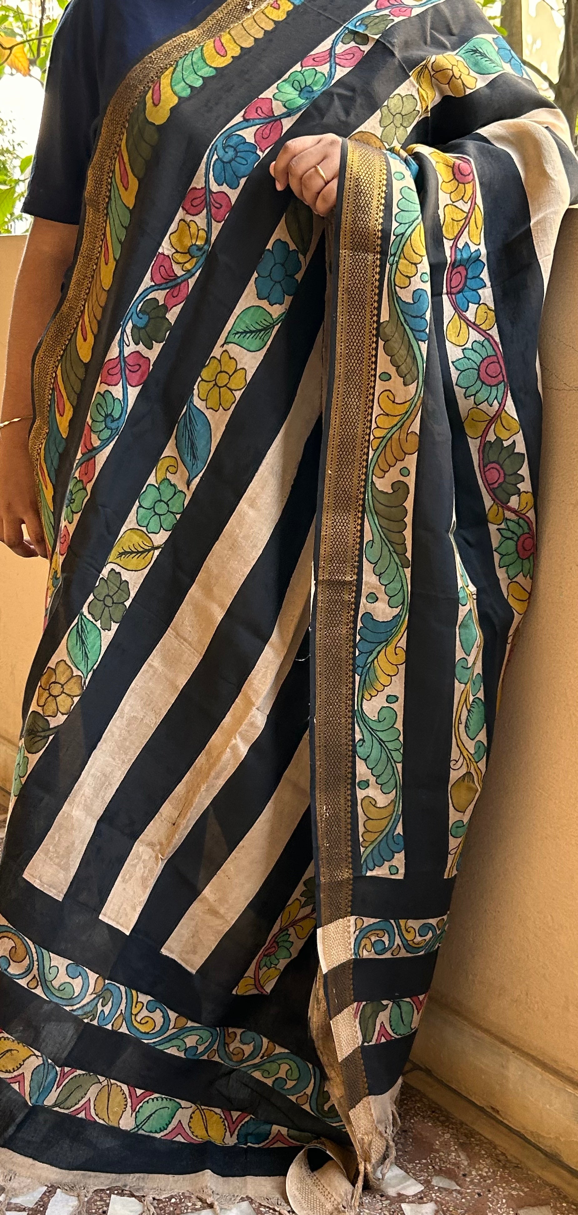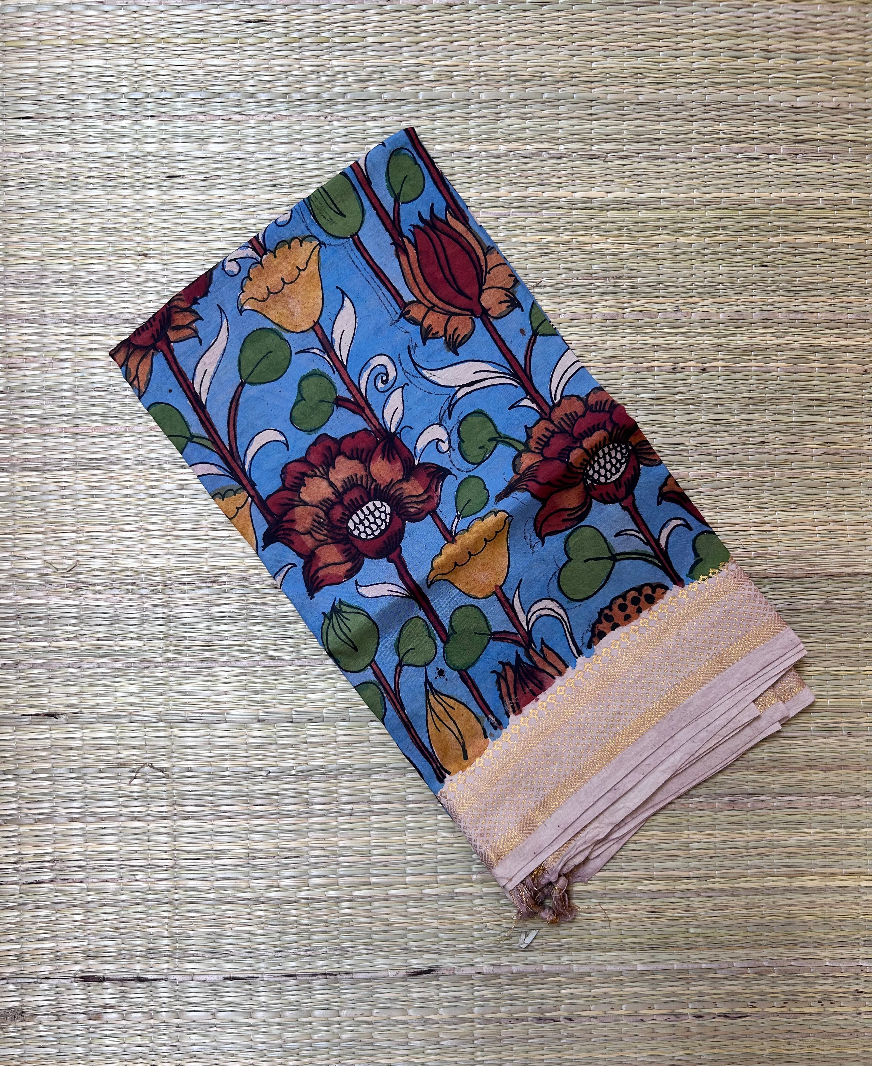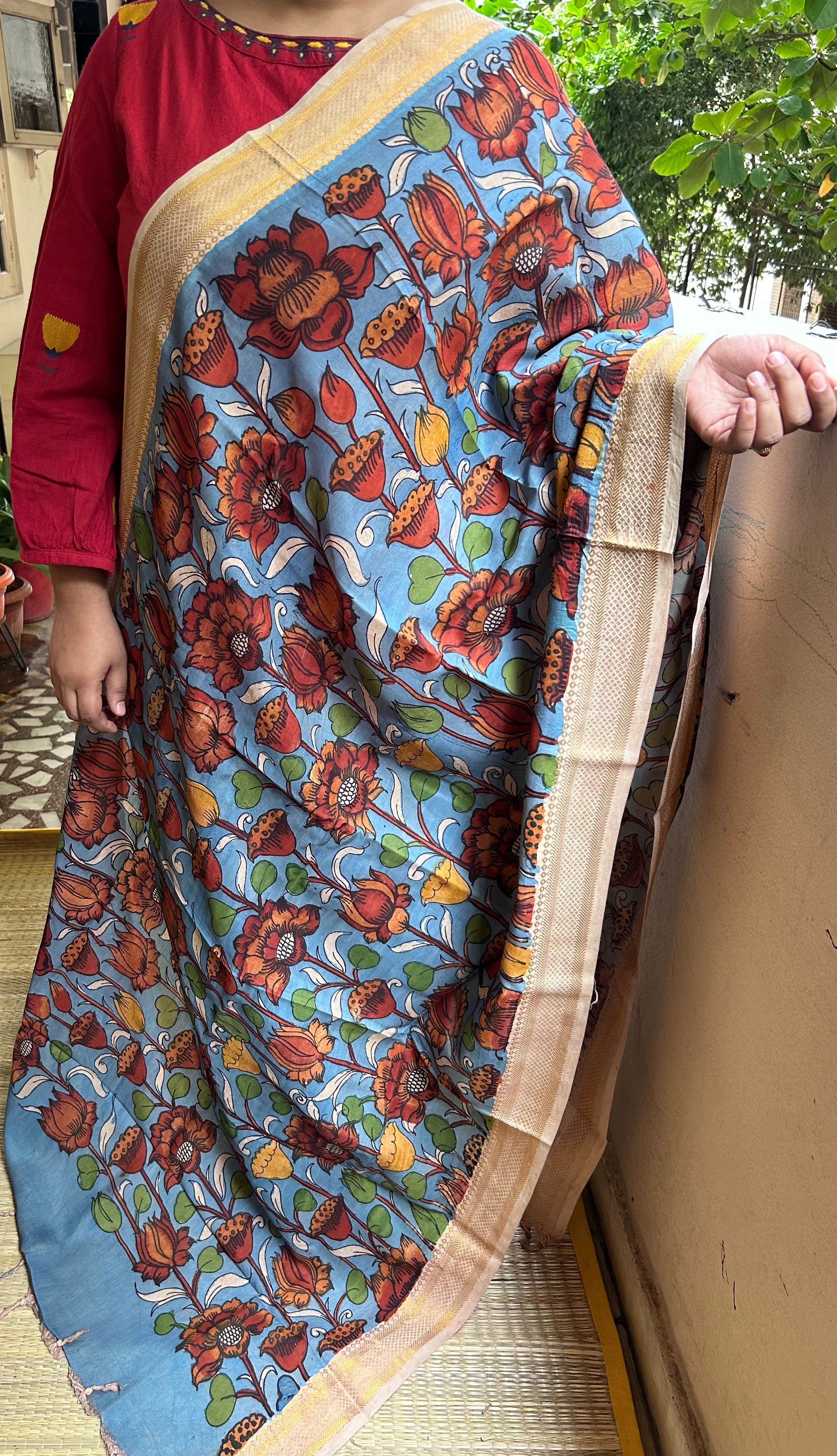 Blue Pen Kalamkari Dupatta in Mangalagiri Silk