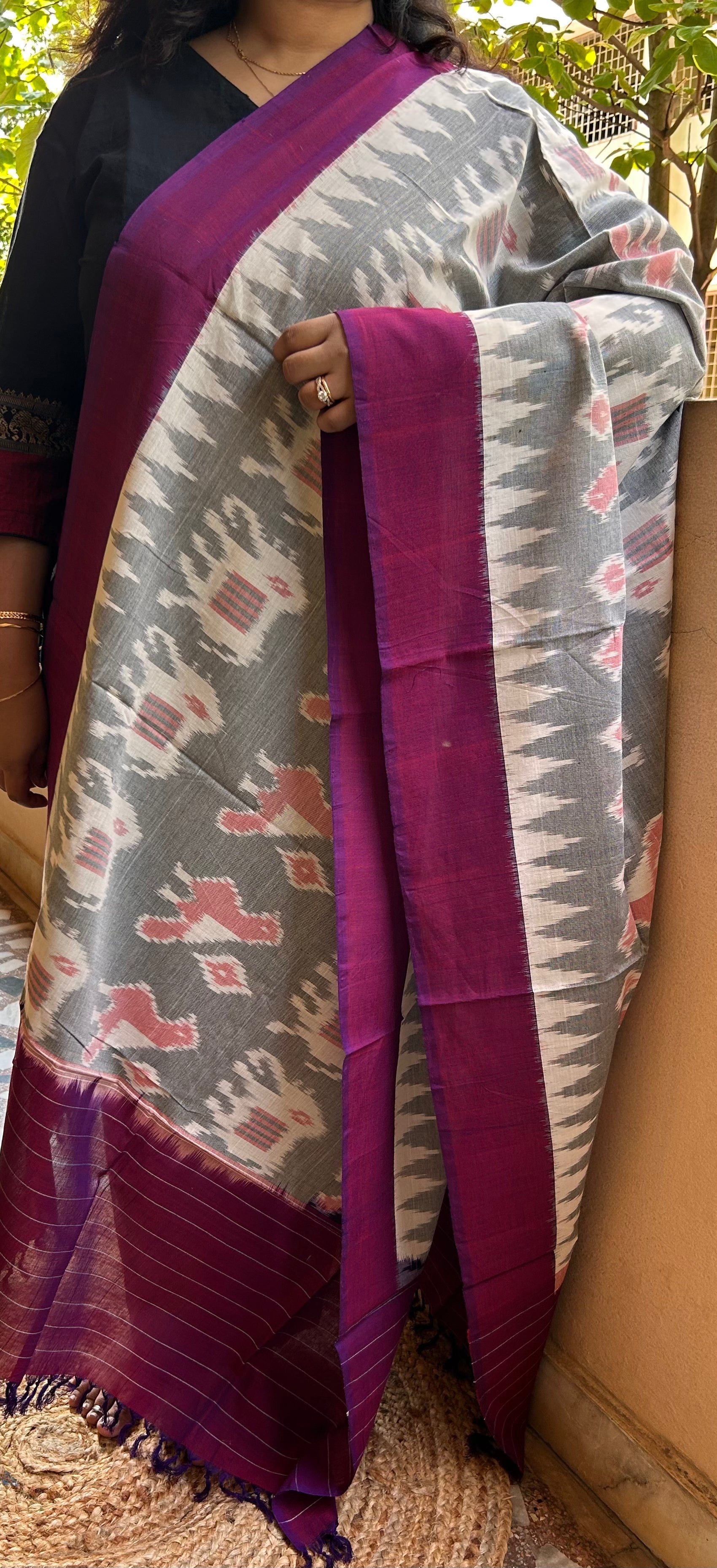 Gray and Violet Handloom Ikkat Cotton Dupatta