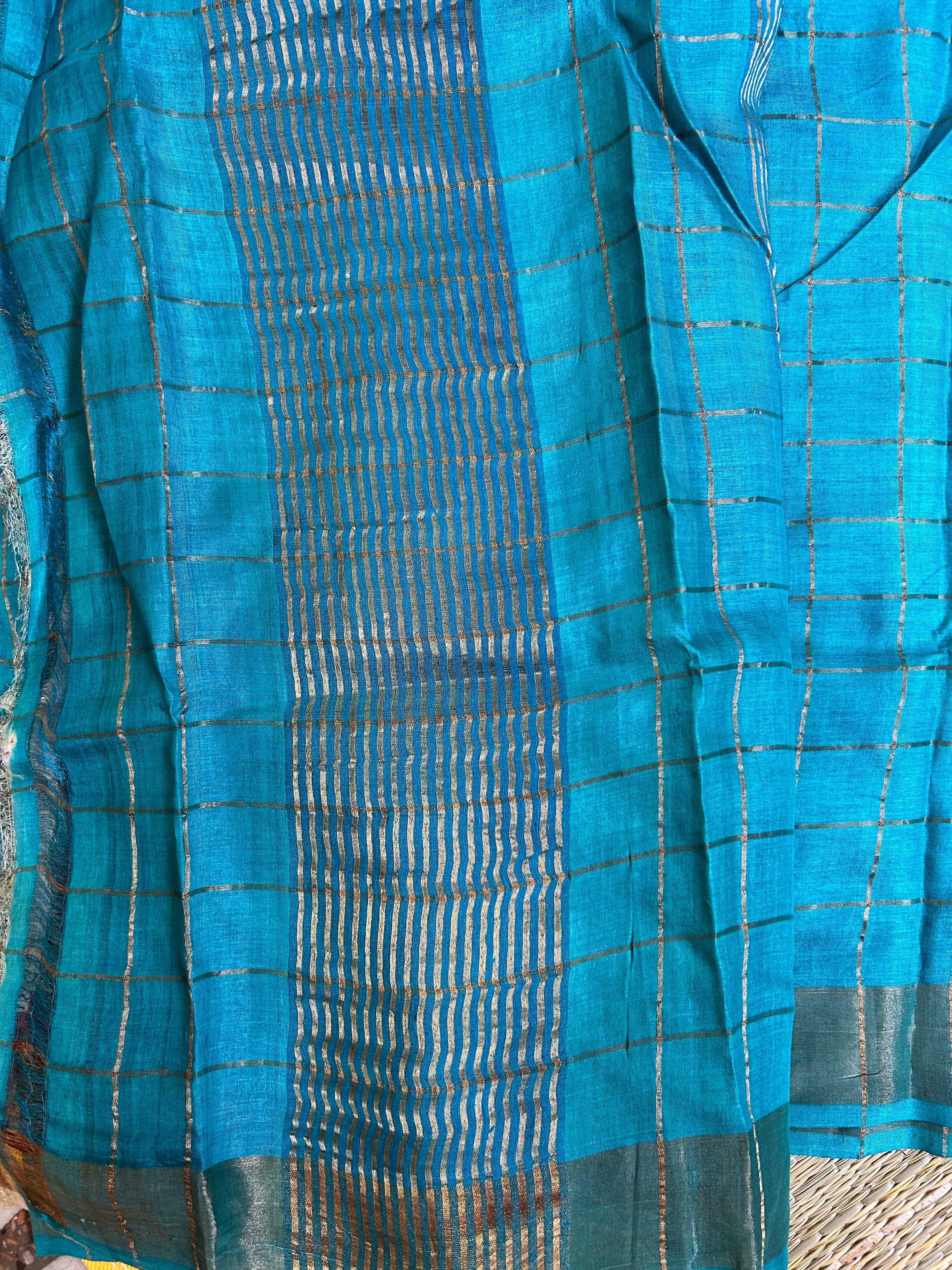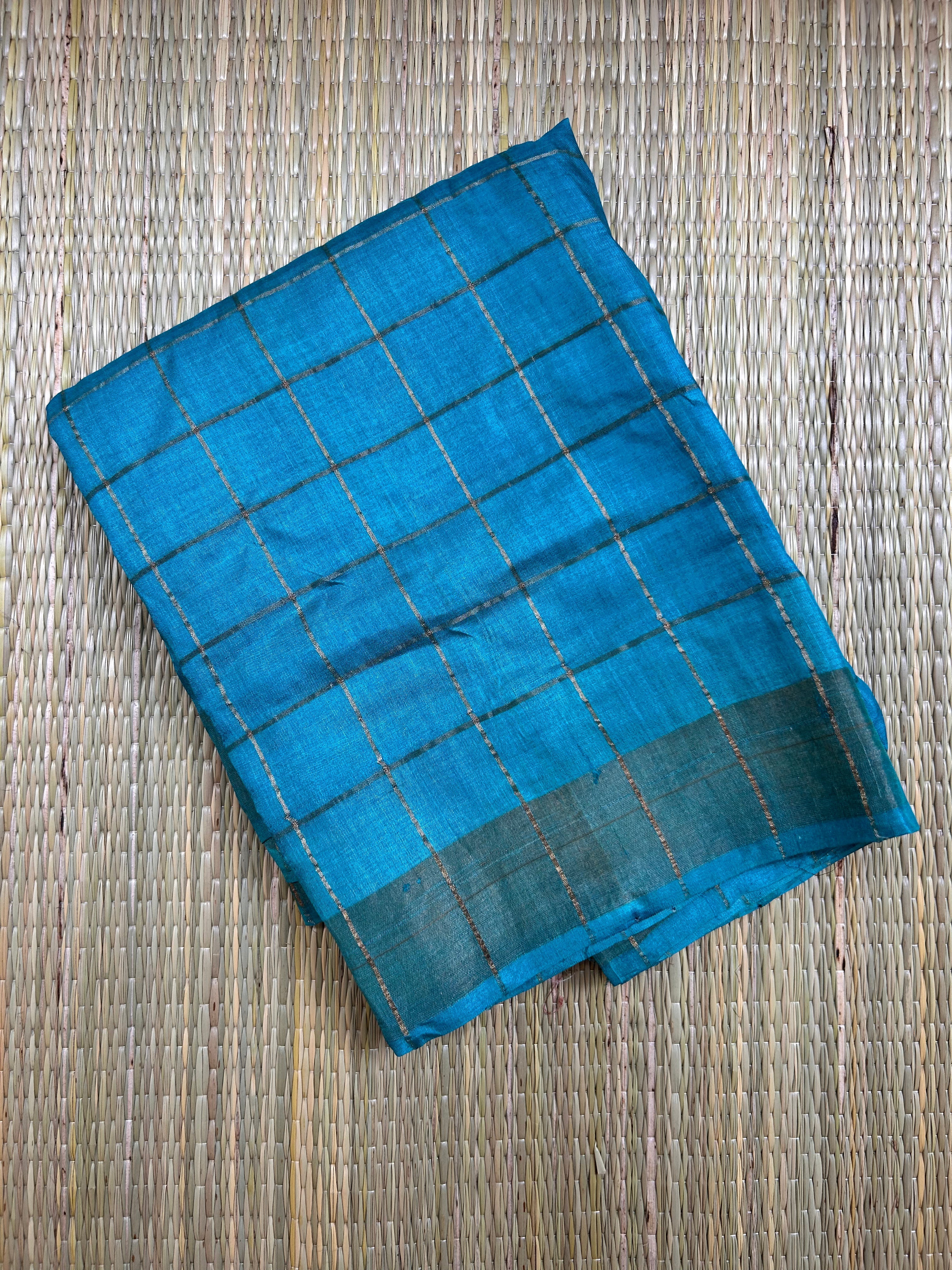 Sea Green Pure Tussar silk saree in Zari cheks