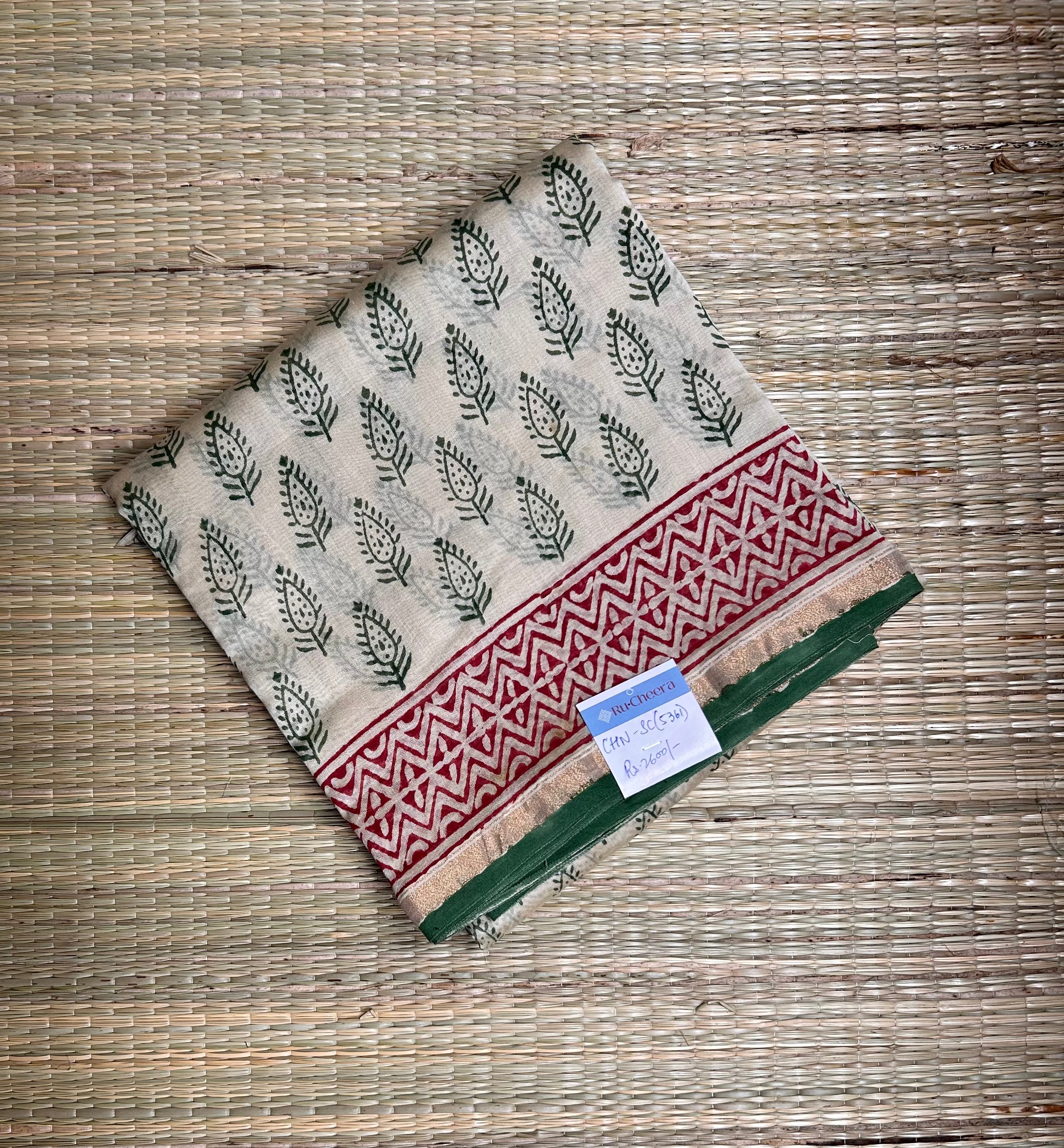 Beige & Green Handblock-Printed Chanderi Saree