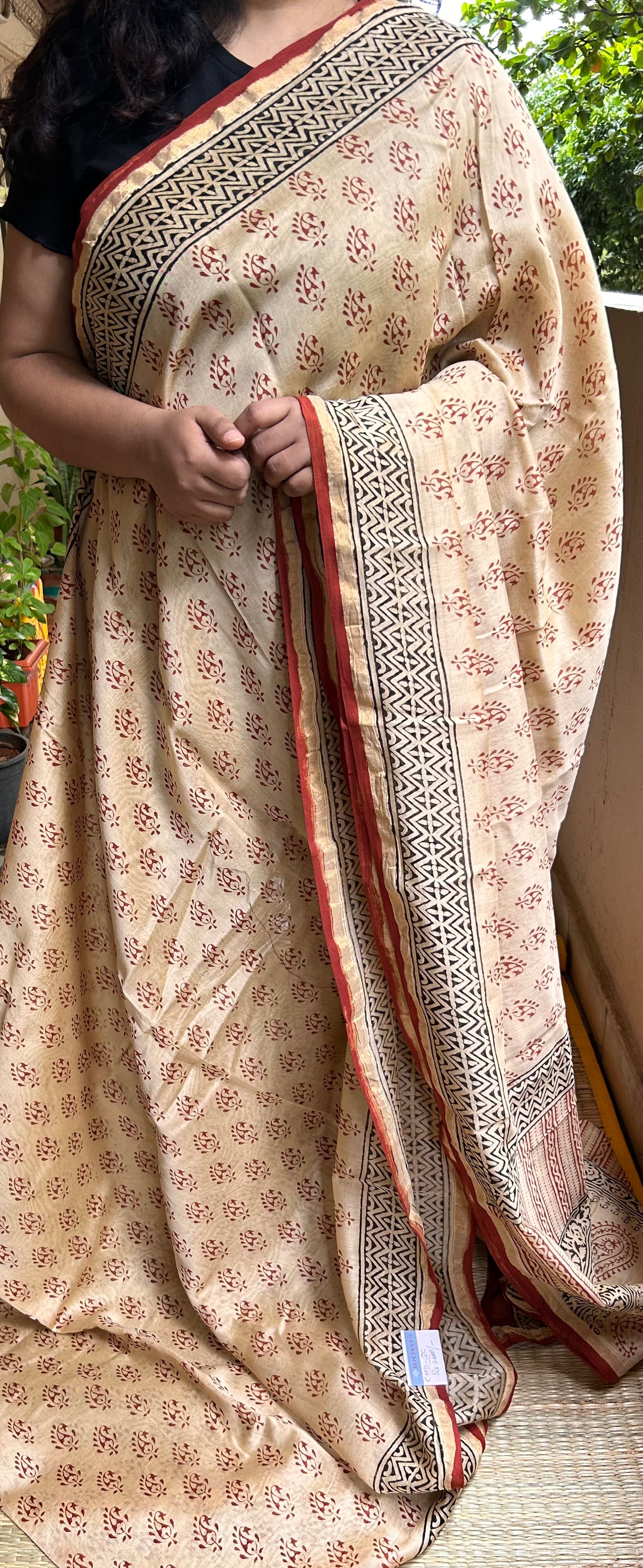 Beige & Black Block-Printed Chanderi Saree